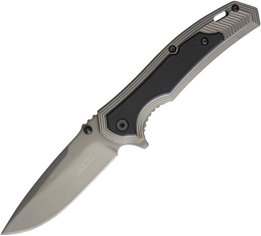 Assisted opening. 4.5″ closed. 3.25″ gray titanium coated stainless drop point blade. Gray titanium finish stainless handle with black G10 onlay. Extended tang. Thumb stud. Pocket clip. Lanyard hole. Boxed.