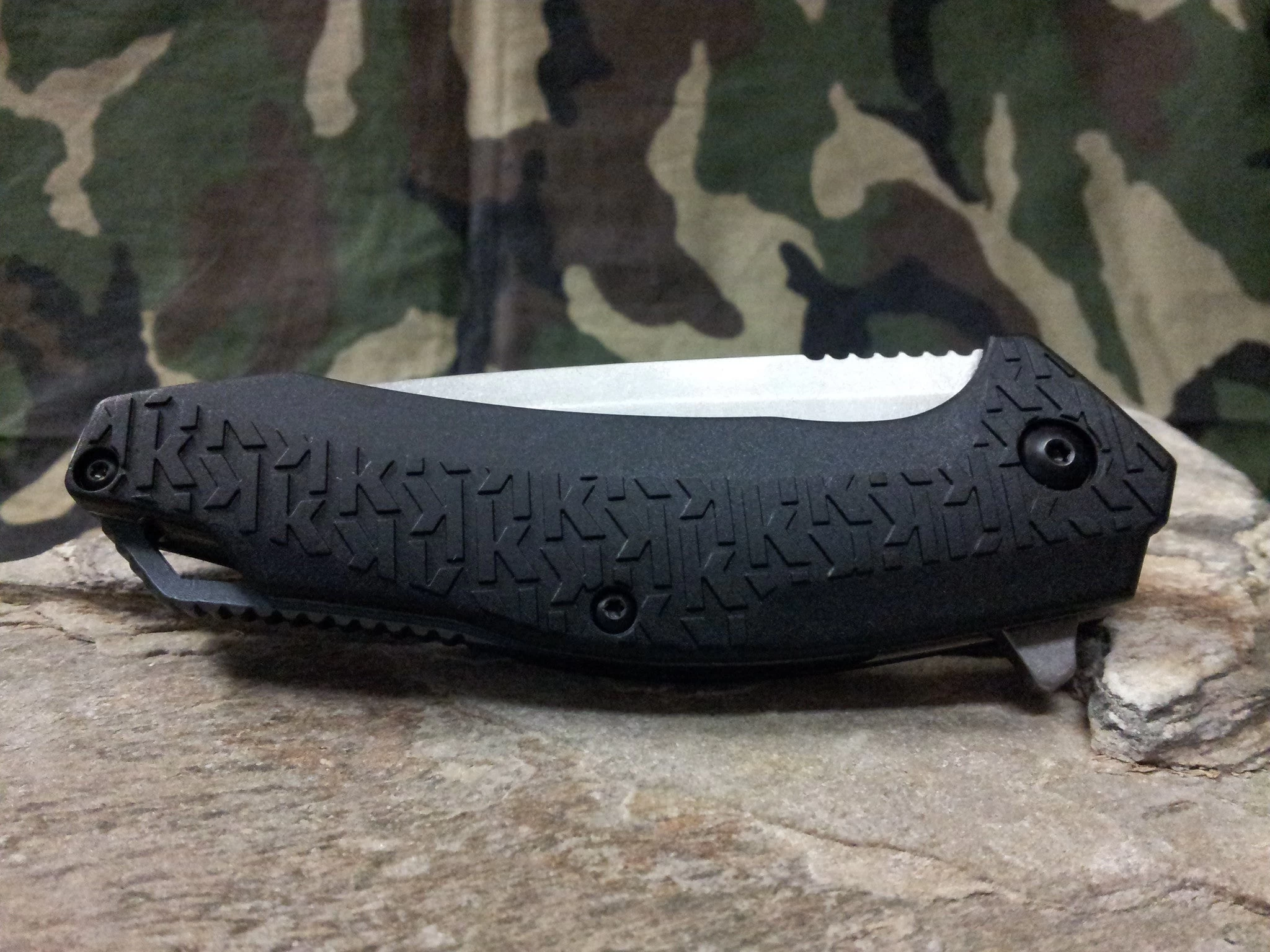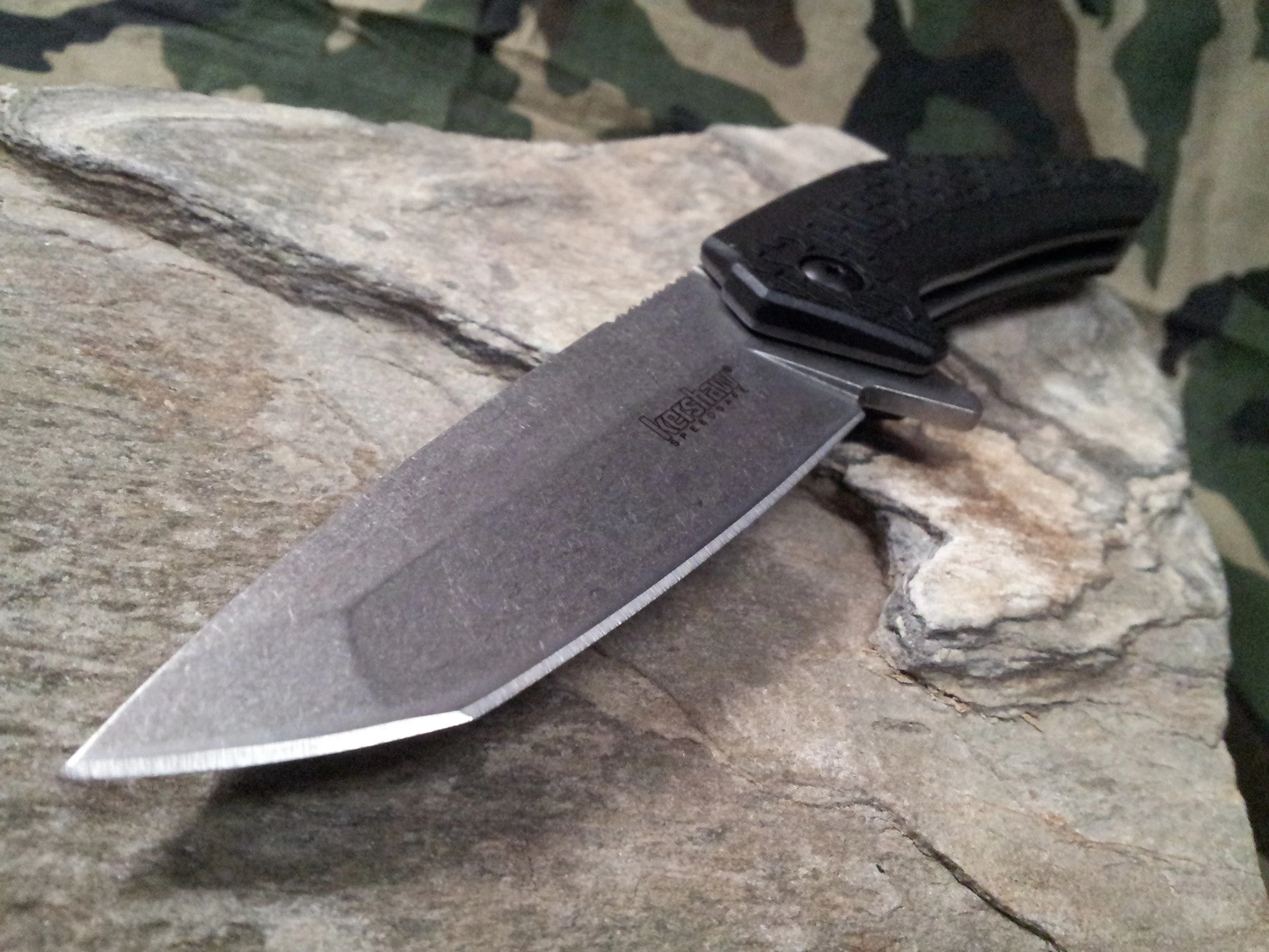 4 1/4″ closed linerlock. 3 1/4″ stonewash finish 8Cr13MoV stainless modified tanto blade with thumb ramp and extended tang. Features SpeedSafe torsion bar mechanism for assisted opening. Black glass filled nylon handles with black rubberized K-Texture inserts that provide a secure grip, even in extreme conditions, plus multiple grip options. The exclusive K-Texture also provides additional “tooth” for even more enhanced grip strength. Lanyard slot. Reversible deep-carry stainless pocket clip.