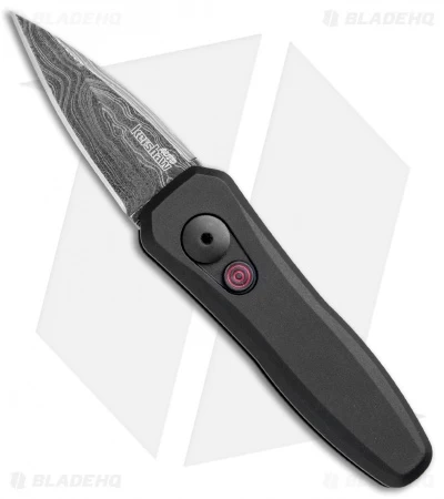 This Blade HQ Exclusive Kershaw Launch 4 features a Damascus blade and a black anodized aluminum handle.