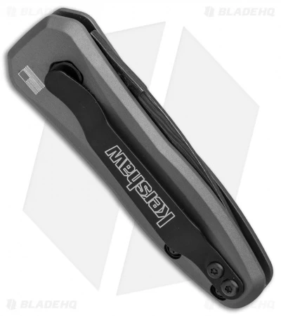 This Blade HQ Exclusive Kershaw Launch 4 features a black Damascus blade and a gray aluminum handle.